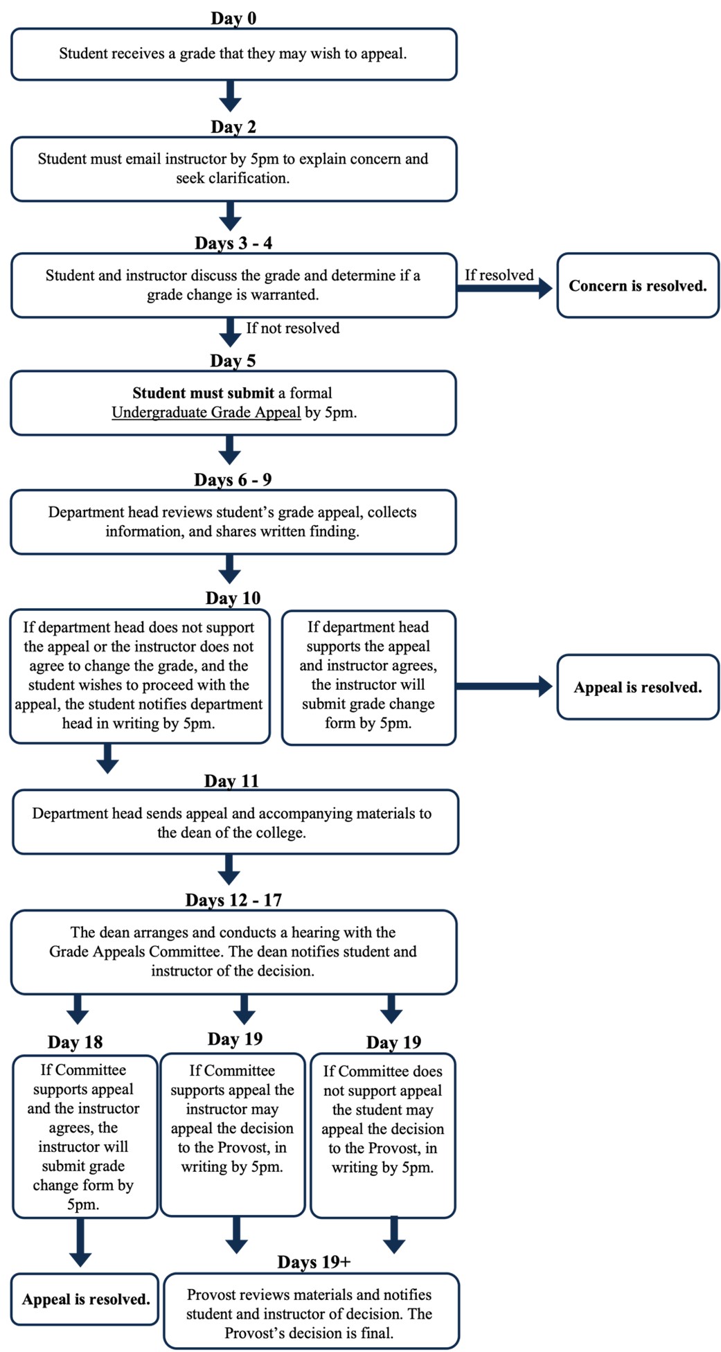 - If the committee’s finding does not support the student’s appeal, or if the final course grade is changed by the faculty member and the student still wishes to further appeal that grade, then they may appeal the finding to the Provost, in writing, within two (2) business days.